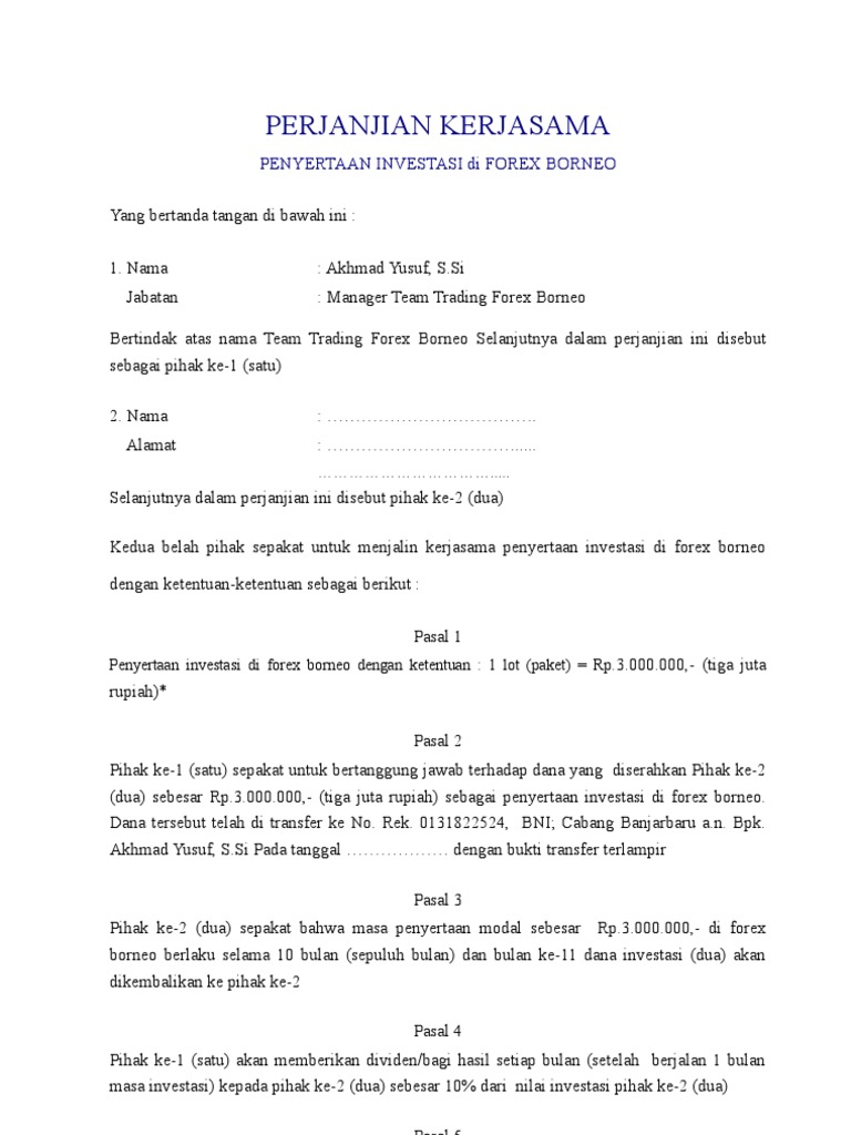 Seperti surat pernyataan kerja bermaterai, perjanjian, dan pernyataan belum menikah. Perusahaan umumnya dapat melakukan kerjasama dengan perusahaan lain baik dibidang keuangan seperti surat perjanjian kerjasama investasi. Kerjasama tersebut bisa dilakukan oleh dua orang atau dua pihak, bahkan juga lebih. Contoh surat perjanjian kerja sama modal dagang download gratis. Contoh surat perjanjian kerjasama investasi modal usaha ini digunakan sebagai keterangan dan pengikat dua belah pihak yang melakukan kerjasama. Anda bisa menggunakan surat perjanjian ini jika. Contoh surat perjanjian kerjasama perusahaan. Dokumen ini bertujuan untuk menjelaskan syarat dan ketentuan hubungan di antara pihak yang terkait. Contoh surat perjanjian kerjasama penggaduhan babi. Surat pernyataan merupakan salah satu surat yang umum digunakan untuk berbagai macam hal. Kedua pihak akan mendapatkan keuntungan hasil usaha menurut persentase keuntungan yang disepakati. Yang bertanda tangan di bawah ini Contoh surat pernyataan adalah surat yang digunakan untuk menyatakan sesuatu kepada penerima.